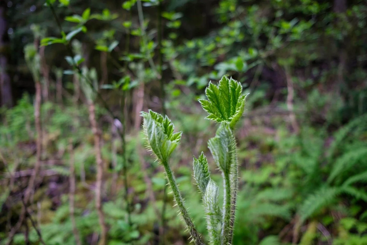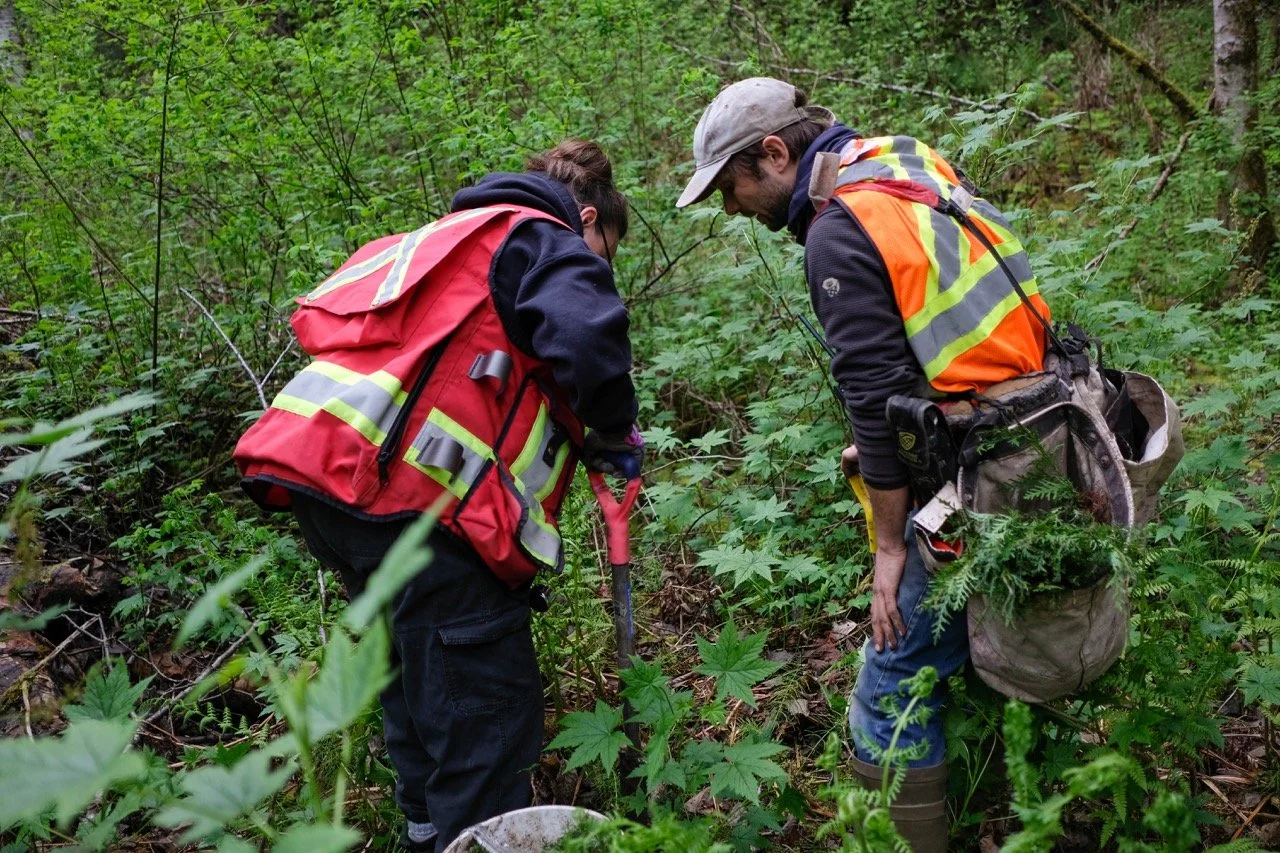 Following IWI's Regional Watershed Gathering in the Skeena River Valley, the Kitsumkalum team graciously invited the IWI team to join them for a morning of tree planting, providing a glimpse into their stewardship efforts in and around the city of Terrace. Led by Mandi, Kitsumkalum Fish and Wildlife Technician, and Tammy, Program Administrator, we gathered at their office and convoyed to the creek in our trucks. We arrived with an excess of sandwiches and the wrong footwear for planting, then filled our buckets with Sitka Spruce, Hemlock, Fir, and Cedar saplings—native species crucial for riparian restoration—and each grabbed a speed spade. Crossing a stream, with varying success in staying dry while walking over the log, we pushed past Devil’s Club, blooming Salmonberry bushes, young nettle plants, and sword ferns. After a brief planting demonstration from Loïc, a Biologist in Training with Westland Resources, the group dispersed to begin planting.